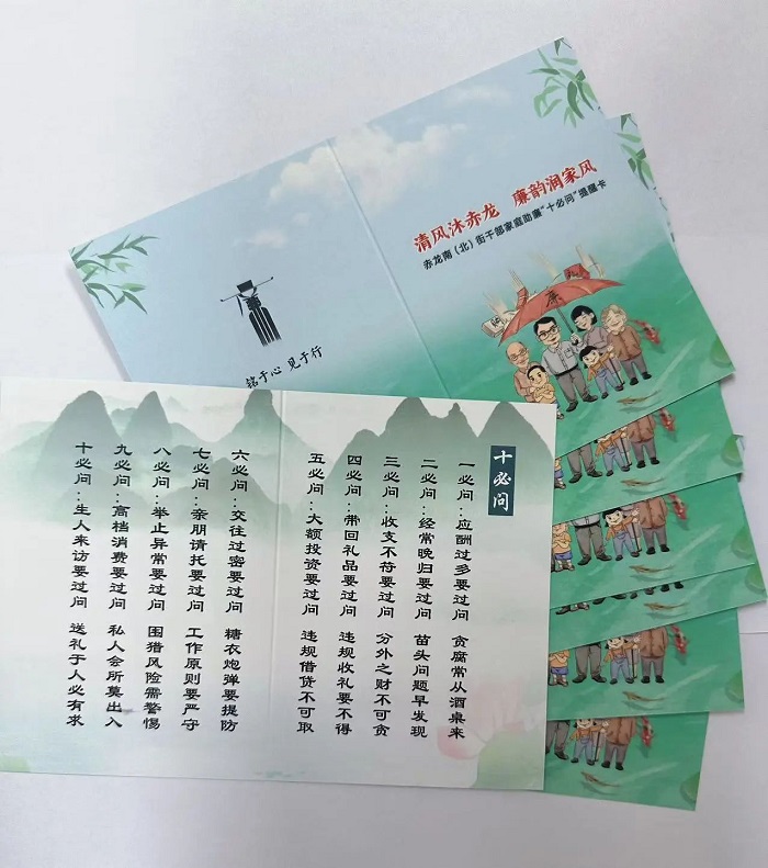 街道纪工委精心制作家庭助廉“十必问”提醒卡,发放到每一名干部家属手中,从“谨防围猎、崇俭戒奢、志存高远、择友而交”等多个视角,将廉洁齐家的责任从纸上落到心上,号召广大干部家属常吹“廉洁风”、念好家庭“廉洁经”、管好家庭“廉洁账”,让亲情监督时刻在线、敬廉崇洁蔚然成风。