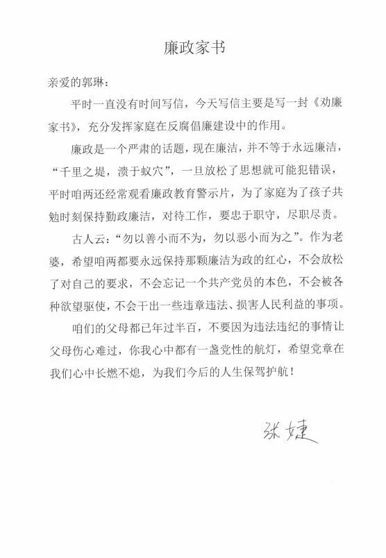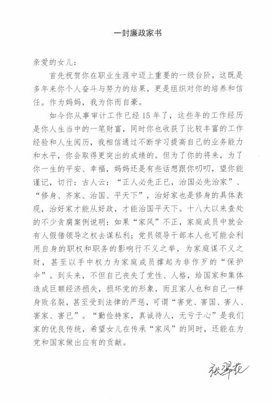 为深入学习贯彻习近平总书记关于党员领导干部家风建设的重要讲话精神和重要指示要求,落实十九届中央纪委六次全会关于加强家风家教建设的部署要求,进一步传承光荣传统、弘扬优良家风,在七一建党节到来之际,区纪委监委、区档案馆、区妇联联合开展了“清风寄语·家书话廉”红色家书、家风家训、治家格言征集活动,共征集到党员干部、公职人员、群众为亲人写的家书99篇。 一封封家书,在家人、亲人、朋友之间共沐清风话清廉,让正能量在亲情中凝聚,共同营造风清气正的良好氛围。现选取部分书信,邀您一起品廉文、悟廉心、践廉行。 西青区审计局篇 作者:张婕 作者:张翠花