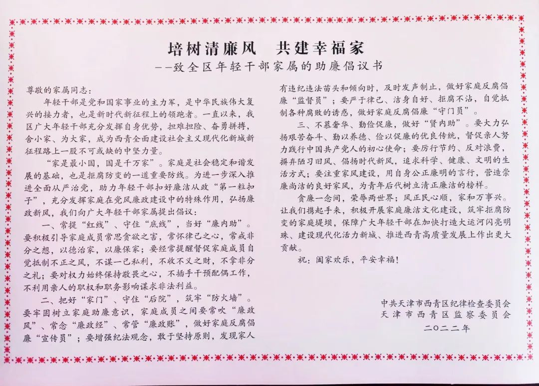 贪廉一念间,荣辱两世界;风正民心顺,家和万事兴。让我们携起手来,积极开展家庭廉洁文化建设,筑牢拒腐防变的家庭堤坝,保障广大年轻干部在加快打造大运河闪亮明珠、建设现代化活力新城、推进西青高质量发展上作出更大贡献。