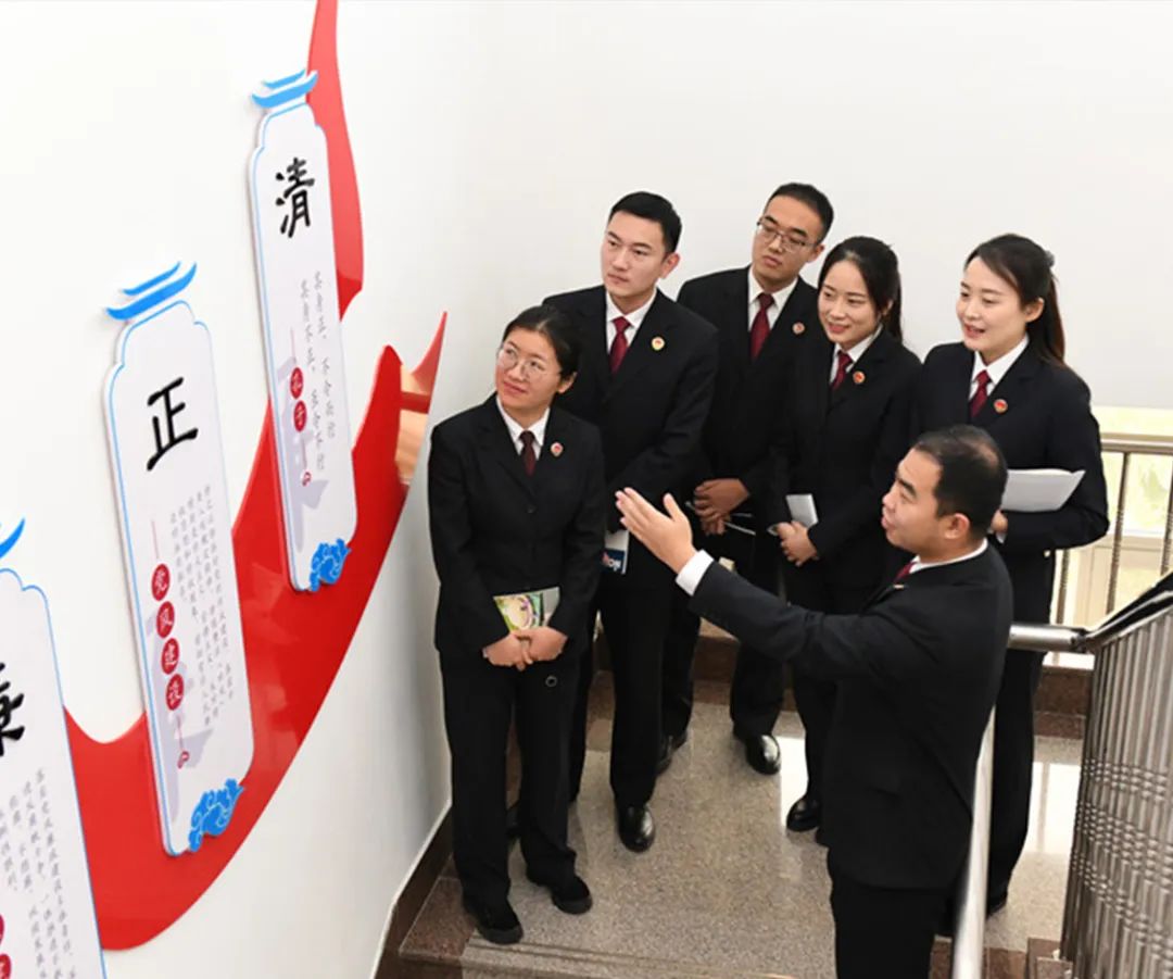 对提职干警进行任前廉政谈话,对新招录干警、书记员进行“四个一”入职廉政教育,从工作伊始筑牢纪律作风“红线”。以大会宣讲、集中学习、电子屏滚动播放、公示栏公布、内网刊登等多种形式全方位申明高检院《禁酒令》、新时代政法干警“十个严禁”、 《党员廉洁自律规范》及相关“廉政警句”等廉政纪律要求。组织参观廉政文化宣传墙,制作廉政小视频,组织廉政书法展示,利用“两微一端”、内网信息发布系统等多种媒介载体讲好廉政故事,传播廉政声音,将廉政文化融入机关文化、支部建设,真正让廉政文化内化于心、外化于行。