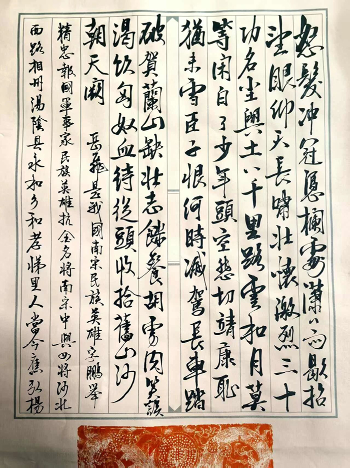 明朝时期,岳家开祖先随着明成祖朱棣迁都北京来到天津,承担保卫首都,保卫大运河的任务,在西青区辛口镇创置了岳家开村,至此,岳家后人已传承600多年,岳飞一生戎马倥偬,在国家生死存亡之际,义无反顾投身抗金的斗争中,率领岳家军奋勇杀敌,成功击退了来犯的金兵,收复失地,保卫了社稷江山,守护了国家安全。至此,“精忠报国”成为了岳家后人的家风家训。