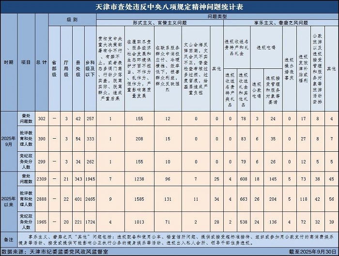 2025年以来,截至9月30日,天津市查处违反中央八项规定精神问题情况如下: