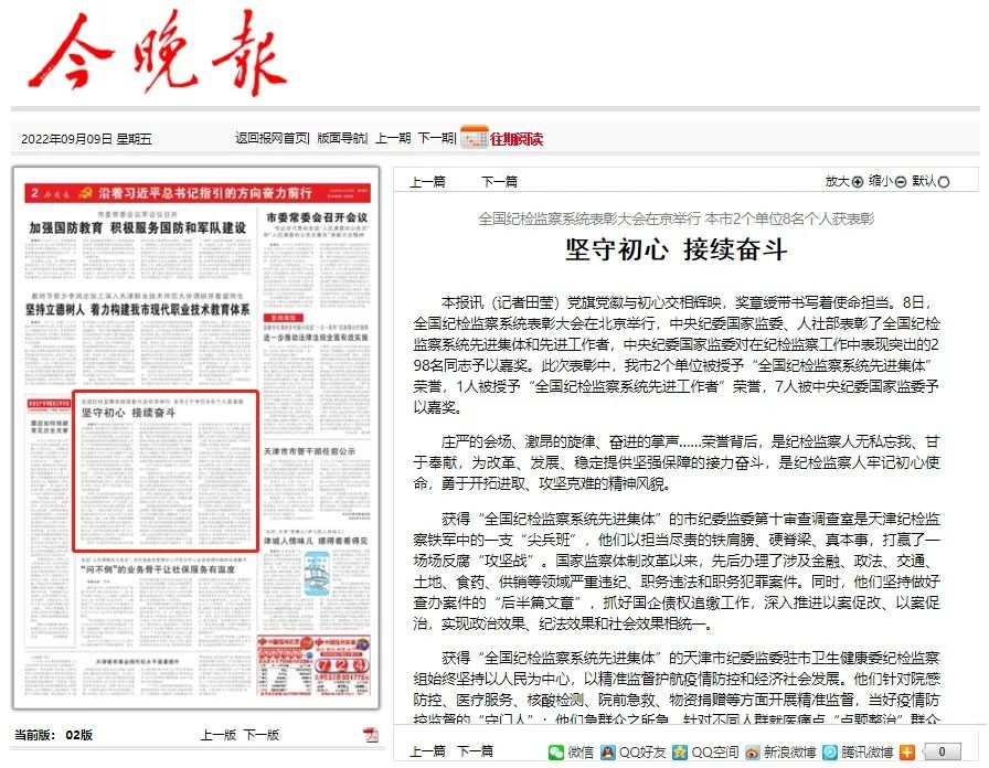 《今晚报》刊文截图 党旗党徽与初心交相辉映,奖章绶带书写着使命担当。8日,全国纪检监察系统表彰大会在北京举行,中央纪委国家监委、人社部表彰了全国纪检监察系统先进集体和先进工作者,中央纪委国家监委对在纪检监察工作中表现突出的298名同志予以嘉奖。此次表彰中,我市2个单位被授予“全国纪检监察系统先进集体”荣誉,1人被授予“全国纪检监察系统先进工作者”荣誉,7人被中央纪委国家监委予以嘉奖。 庄严的会场、激昂的旋律、奋进的掌声……荣誉背后,是纪检监察人无私忘我、甘于奉献,为改革、发展、稳定提供坚强保障的接力奋斗,是纪检监察人牢记初心使命,勇于开拓进取、攻坚克难的精神风貌。 获得“全国纪检监察系统先进集体”的市纪委监委第十审查调查室是天津纪检监察铁军中的一支“尖兵班”,他们以担当尽责的铁肩膀、硬脊梁、真本事,打赢了一场场反腐“攻坚战”。国家监察体制改革以来,先后办理了涉及金融、政法、交通、土地、食药、供销等领域严重违纪、职务违法和职务犯罪案件。同时,他们坚持做好查办案件的“后半篇文章”,抓好国企债权追缴工作,深入推进以案促改、以案促治,实现政治效果、纪法效果和社会效果相统一。 获得“全国纪检监察系统先进集体”的天津市纪委监委驻市卫生健康委纪检监察组始终坚持以人民为中心,以精准监督护航疫情防控和经济社会发展。他们针对院感防控、医疗服务、核酸检测、院前急救、物资捐赠等方面开展精准监督,当好疫情防控监督的“守门人”;他们急群众之所急,针对不同人群就医痛点“点题整治”群众急难愁盼问题;他们督促新建急救站点、增加救护人员和急救车辆,护航津城百姓“生命高速路”。 在平凡岗位上超越平凡,在伟大时代中书写伟大。 “成绩的背后不仅有个人的努力和付出,更离不开集体的支持和帮助,组织的关怀和温暖,领导的信任和鼓励。”荣获“全国纪检监察系统先进工作者”的市纪委监委第三监督检查室干部史会勇表示。同时,他的话也道出了大家的心声:这份荣誉对自己而言,更是一份激励,鞭策着自己踔厉奋发、笃行不怠。 滨海新区纪委常委、监委委员、区纪委监委第六审查调查室主任、一级调研员崔笑飞,在反腐败战线上摸爬滚打了30年,此次获得嘉奖。他告诉记者:征途漫漫,惟有奋斗!绝不辜负领导和同志们的期盼,绝不辜负这份沉甸甸的荣誉,努力为全市纪检监察工作高质量发展贡献全部的智慧和力量,让自己这柄“反腐尖刀”永不卷刃。 获得嘉奖的市纪委监委驻市公安局纪检监察组干部沙书瑜表示,一定要以赤诚铸忠诚,扛牢监督首责,坚决把对党忠诚印在心中、深入骨髓、融入血液,要用严实深细的工作作风和精益求精的工作标尺要求自己,以监督执纪的“力度”和为民服务的“温度”守护群众获得感、幸福感、安全感。 “在今后的工作中,我将以此嘉奖为新的起点接续奋斗,努力为推动高校全面从严治党向纵深发展、向基层延伸贡献自己的力量,以风清气正的政治生态沁润学生心灵,引导学生时刻自重自省,严守纪法规矩,扣好廉洁从政从业首粒扣子。”获得嘉奖的市纪委监委驻天津理工大学纪检监察组干部毛克洵表示。 获得嘉奖的西青区纪委监委第一派驻纪检监察组副组长张继峰表示,在今后的工作中,将以永远在路上的坚韧和执着,始终不忘初心、牢记使命,立足岗位、坚守职责,永葆忠诚干净担当,以更加饱满的精神状态和良好的工作作风,向党和人民交上满意的答卷。 崇高的事业需要榜样引领,奋斗的精神激发前行力量。全国纪检监察系统表彰大会的消息传来,全市各级纪检监察干部备受触动和鼓舞,大家纷纷表示,将以先进为榜样,以典型为标杆,见贤思齐、比学赶超、争做先锋,始终以坚定的信心、饱满的热情、昂扬的状态,担当新作为、建功新时代、奋进新征程,让党徽在逐梦新征程中熠熠闪光!(田莹)