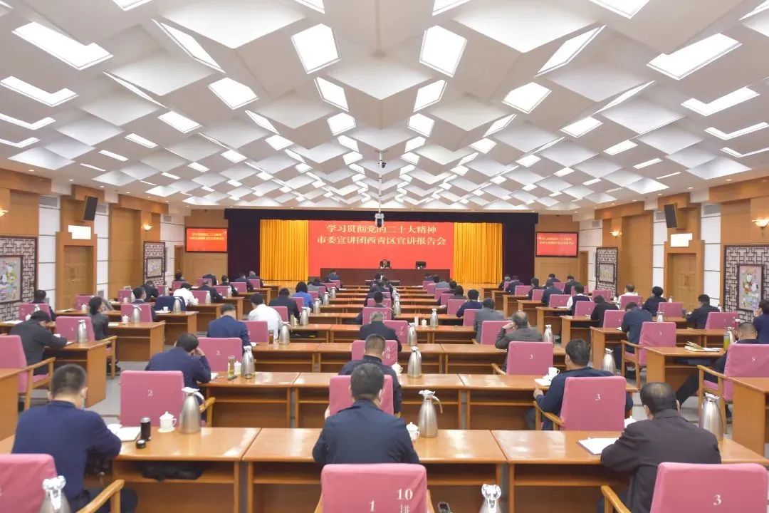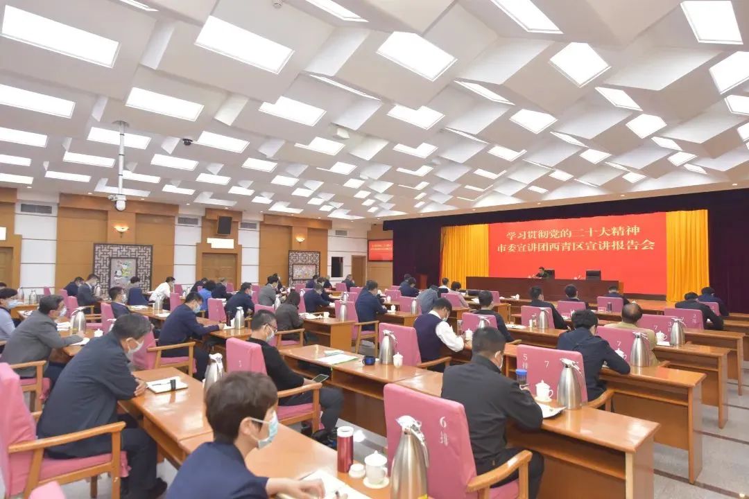 为深入学习宣传贯彻党的二十大精神,根据市委统一安排,11月9日,西青区召开学习贯彻党的二十大精神市委宣讲团西青区宣讲报告会。市委宣讲团成员、西青区委书记朱财斌作党的二十大精神宣讲报告,区委副书记、区长殷学武,区人大常委会主任王志平,区政协主席于强出席,区委副书记齐中波主持。 宣讲中,朱财斌紧密结合西青实际,围绕党的二十大的主题和主要成果、过去5年的工作和新时代10年的伟大变革、开辟马克思主义中国化时代化新境界、以中国式现代化全面推进中华民族伟大复兴、全面建设社会主义现代化国家的目标任务、坚持党的全面领导和全面从严治党、以斗争精神应对风险挑战等七个方面,对党的二十大精神进行了全面深入宣传阐释。 朱财斌指出,中国共产党第二十次全国代表大会是在全党全国各族人民迈上全面建设社会主义现代化国家新征程、向第二个百年奋斗目标进军的关键时刻召开的一次十分重要的大会,是一次高举旗帜、凝聚力量、团结奋进的大会。党的二十大报告为新时代新征程党和国家事业发展、实现第二个百年奋斗目标指明了前进方向、确立了行动指南,是党和人民智慧的结晶,是党团结带领全国各族人民夺取中国特色社会主义新胜利的政治宣言和行动纲领,是马克思主义的纲领性文献。大会对党章作了新的修改,对推进党和国家事业具有重大意义。 朱财斌强调,要按照党中央精神、市委统一部署,结合西青实际,全面抓好党的二十大精神的学习宣传贯彻落实,深入开展多形式、分层次、全覆盖的学习培训,原原本本学、逐字逐句学、深入思考学,各级领导班子和领导干部要带头学、带头讲、带头干,确保党的二十大精神传达到每一个党支部、每一名党员干部和群众。要注重宣传时效,结合西青实际加强理论研究,注重对象化、分众化、互动化,采取群众喜闻乐见的形式,用接地气、泥土味、机油味、田间地头、胡同里巷的语言,推动党的二十大精神进机关、进企事业单位、进城乡社区、进校园、进军营、进各类新经济组织和新社会组织、进网站。要坚定不移用党的二十大精神指导和推动各项工作,把学习宣传贯彻党的二十大精神与深入贯彻落实习近平总书记对天津工作提出的“三个着力”重要要求和一系列重要指示批示精神结合起来,与深入实施京津冀协同发展重大国家战略结合起来,锚定“打造大运河闪亮明珠、建设现代化活力新城”目标,高效统筹疫情防控和经济社会发展,全力防范化解各类风险隐患,确保党的二十大的重要决策部署在西青大地落地见效。 宣讲结束后,朱财斌与参加报告会的党员干部代表围绕加快构建新发展格局、着力推动高质量发展、大力发展实体经济等内容进行交流,并结合西青实际,就持续深化“两城三带三区”布局,大力实施制造业强区战略等内容进行讨论。 会议以电视电话会议形式召开,在区机关会议楼设主会场,各街镇、经开集团设分会场。区委、区人大、区政府、区政协领导班子成员,区人民法院院长、区人民检察院检察长,各部委办局、直属单位、国有企业、各人民团体和党的关系在区的市管单位主要或分管负责同志,各街镇、经开集团领导班子成员,各街镇村、社区党组织书记参加。