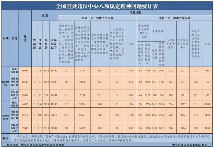 4月27日,中央纪委国家监委公布了2025年3月全国查处违反中央八项规定精神问题汇总情况。当月,全国共查处违反中央八项规定精神问题16994起,批评教育和处理22547人,其中党纪政务处分13671人,这是连续第139个月公布月报数据。