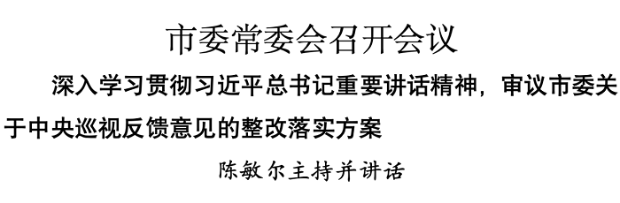 12月9日,市委常委会召开会议,合并召开市委推进中央巡视反馈意见整改工作领导小组会议,深入学习贯彻习近平总书记听取中央巡视情况汇报时的重要讲话精神,审议市委关于中央巡视反馈意见的整改落实方案及有关专项检查反馈问题的整改落实方案,研究部署下一步工作。市委书记陈敏尔主持会议并讲话。