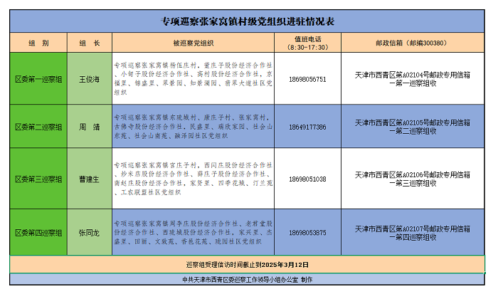 据悉,4个区委巡察组现场工作时间为25天,期间设立专用邮政信箱和值班电话,主要受理反映被巡察村级党组织班子及其成员、下属单位主要负责人和重要岗位人员的来信来电来访,每天电话受理时间为8:30-11:30,13:30-17:30。信访举报受理时间截止到2025年3月12日。具体联系方式如下: