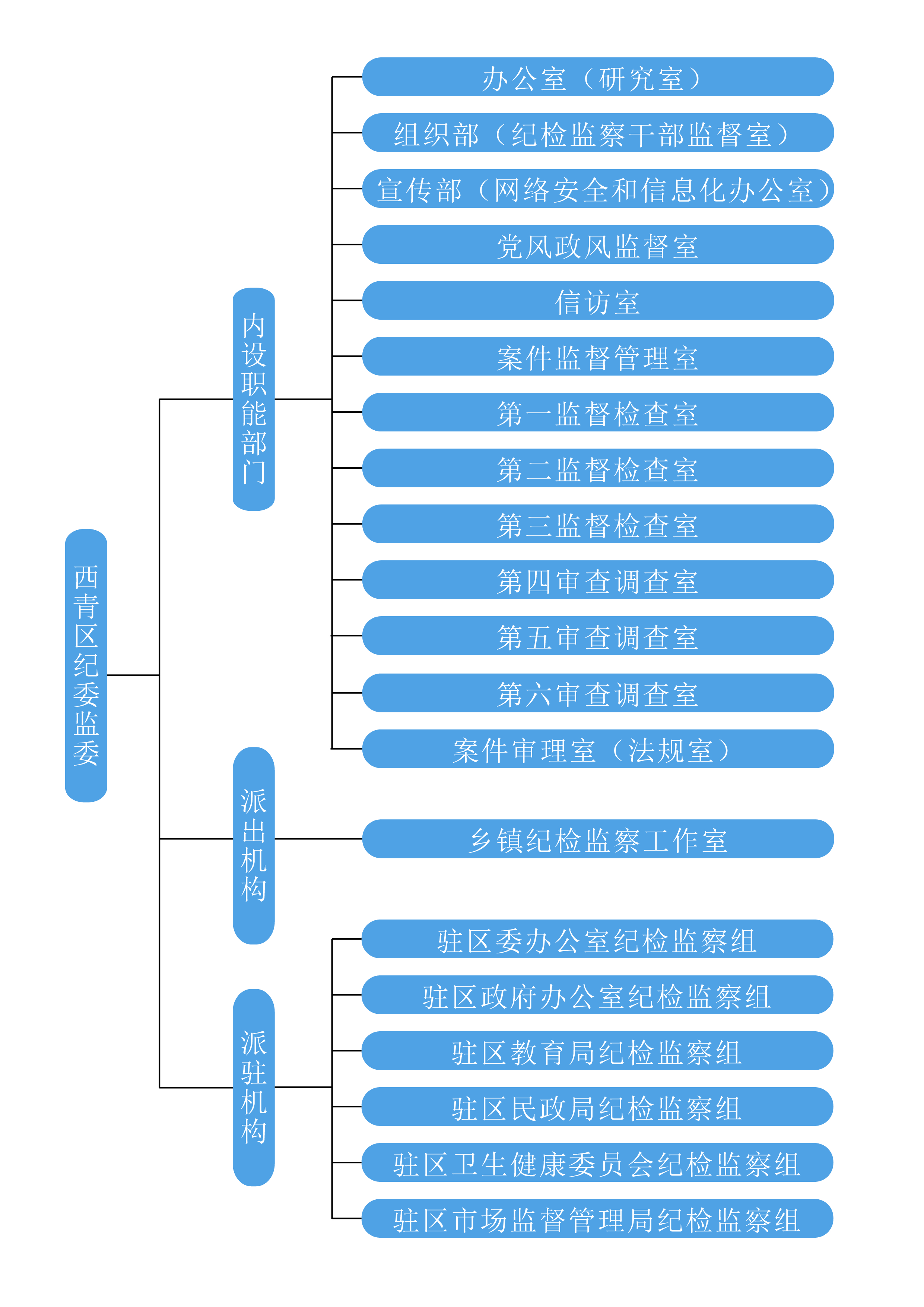 天津市西青区纪委监委组织机构包括:内设机构、派出机构和派驻机构。内设机构具体为:办公室(研究室)、组织部(纪检监察干部监督室)、宣传部(网络安全和信息化办公室)、党风政风监督室、信访室、案件监督管理室、第一至第三监督检查室、第四至第六审查调查室、案件审理室(法规室)。